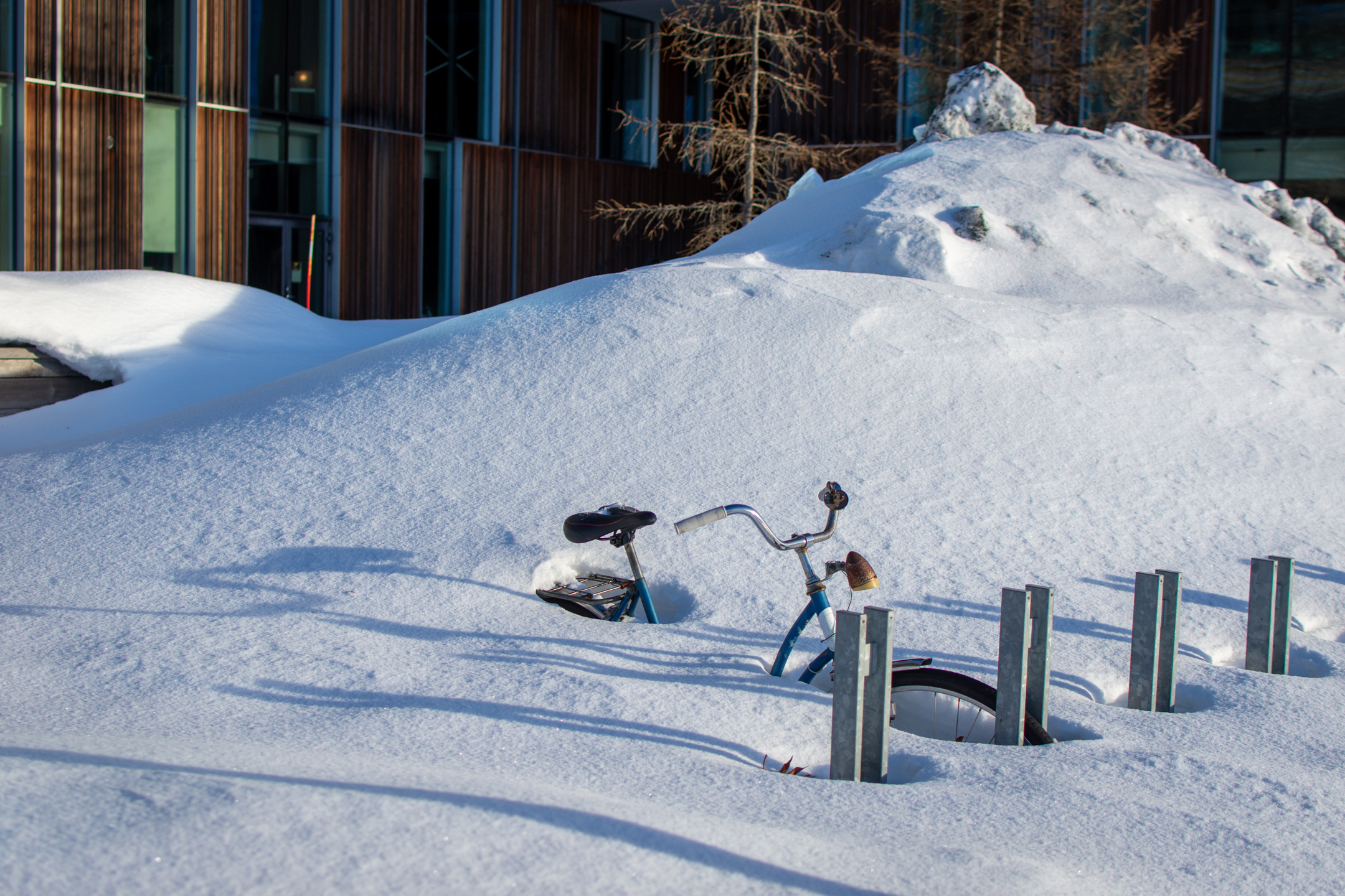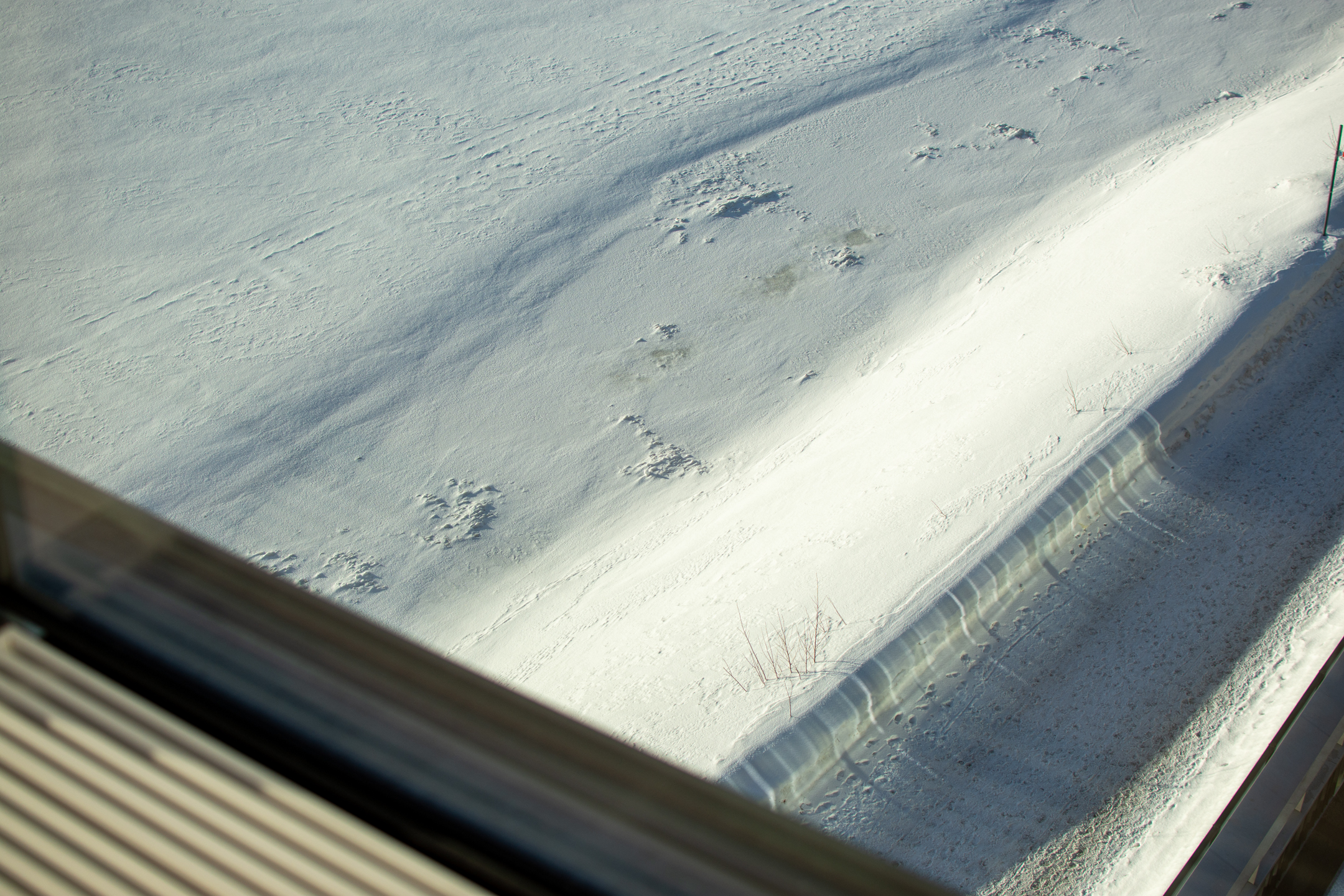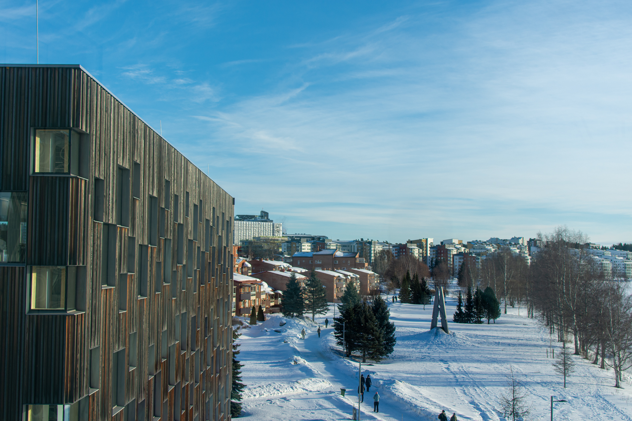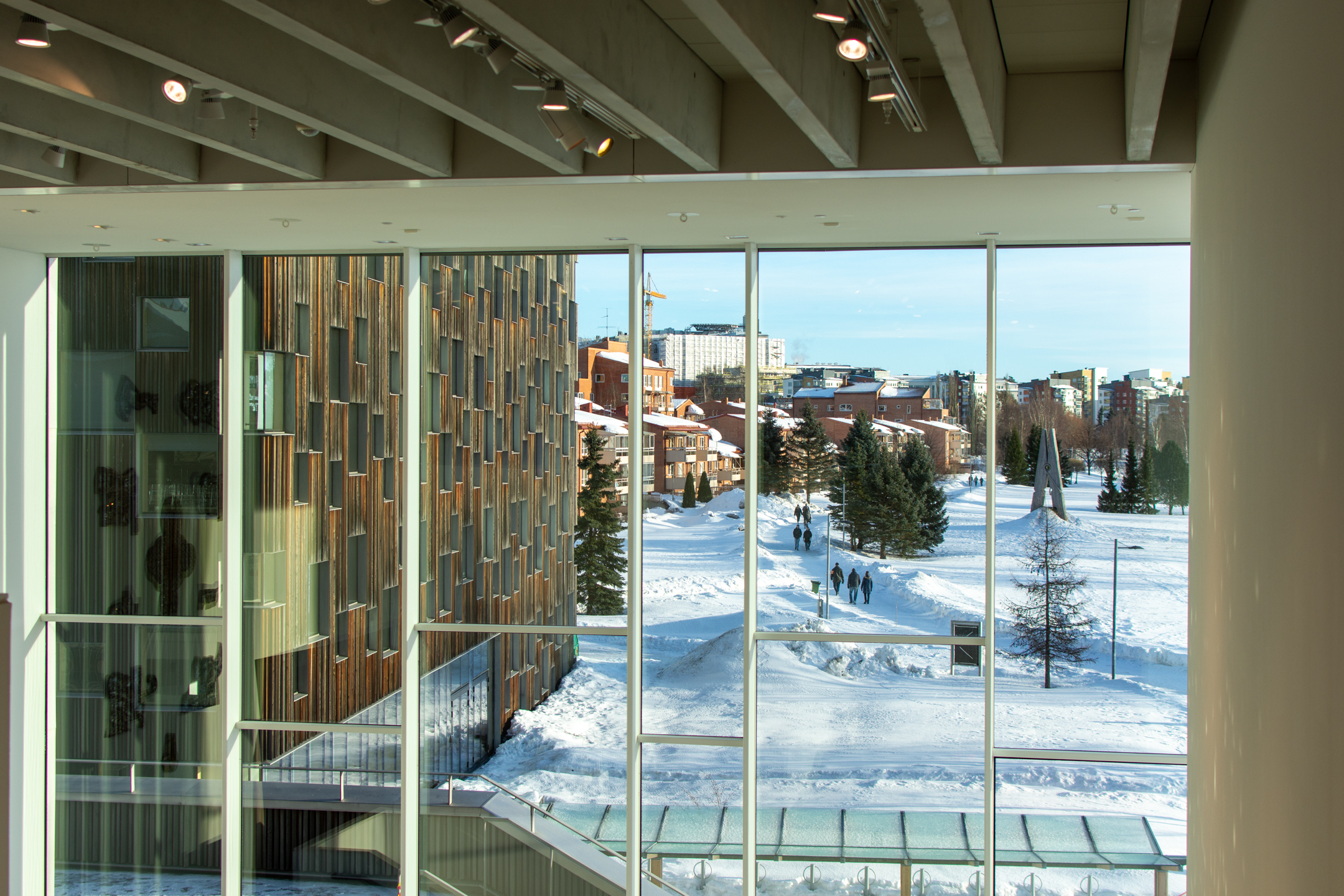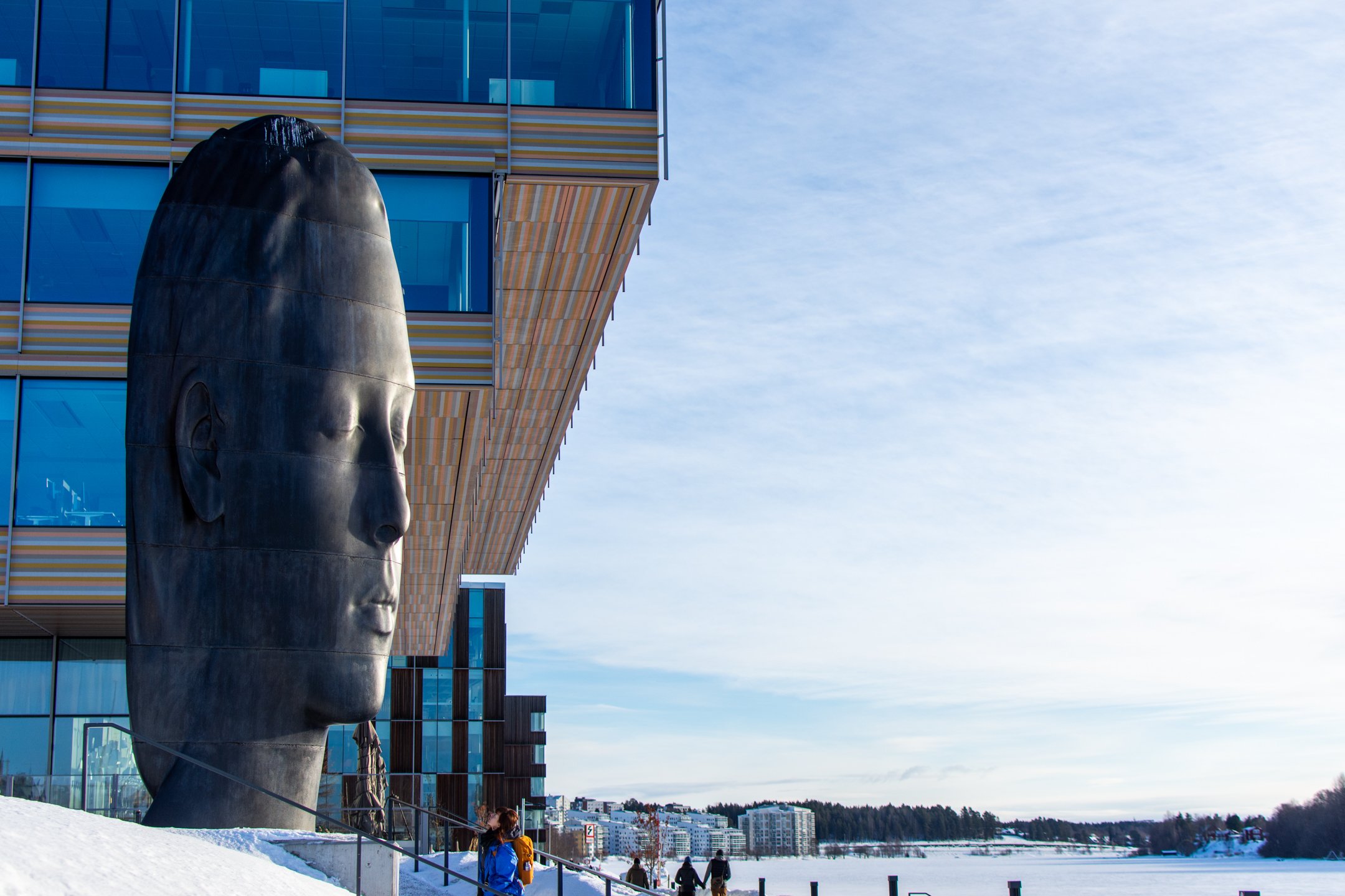 After three beautiful days in the snow it was time to head home, so we took an hour’s bus ride to Umeå, where we had a few hours to kill before our train back to Stockholm. We took a nice walk along the waterfront (ice-front??), and came across a really cool sculpture made by Jaume Plensa. I only took one photo, but it’s designed to look similar from different angles, see here for examples. We then went to a really nice contemporary art museum, Bildmuseet, which as it turns out was designed by the acclaimed Danish Henning Larsen Architects.